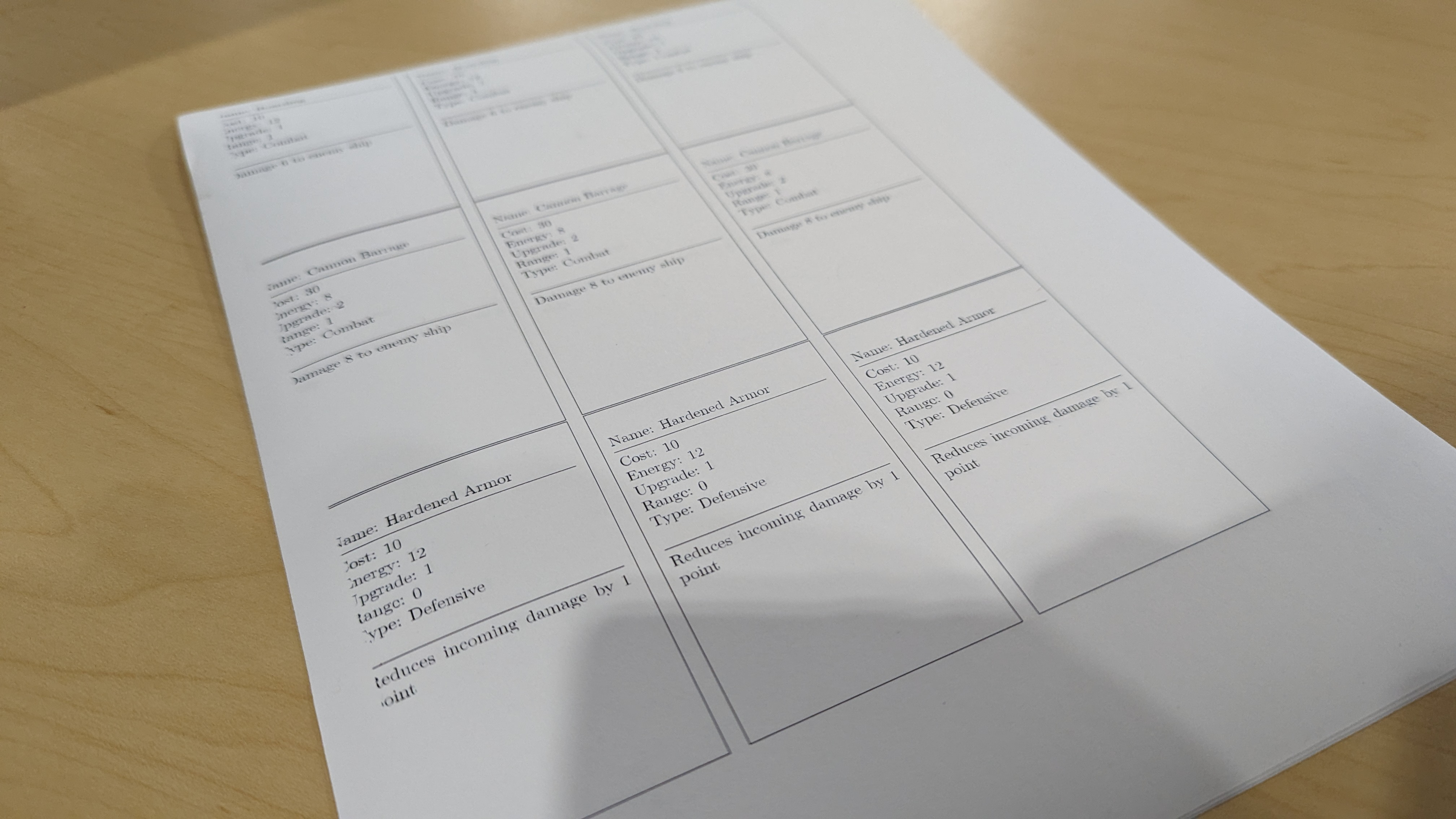 Now we have 10 sets of 3 cards, each with a row of different stats. Ignoring the first line just being the toplevel header for the csv, we basically have a template for mass-producing any kind of card purely just by a spreadsheet. Of course we can do a whole lot to improve this to support arbitrary lengths of data, but I really don’t need that for my usecase. The overall end result actually looks pretty good! (Ignore the lackluster print quality, this is after all prototype materials).